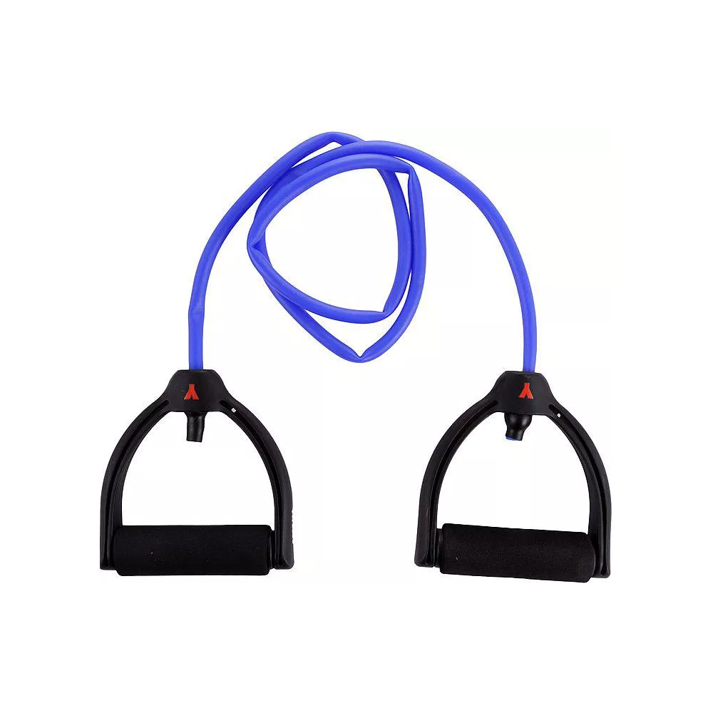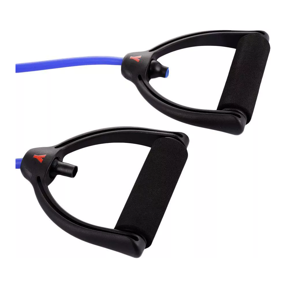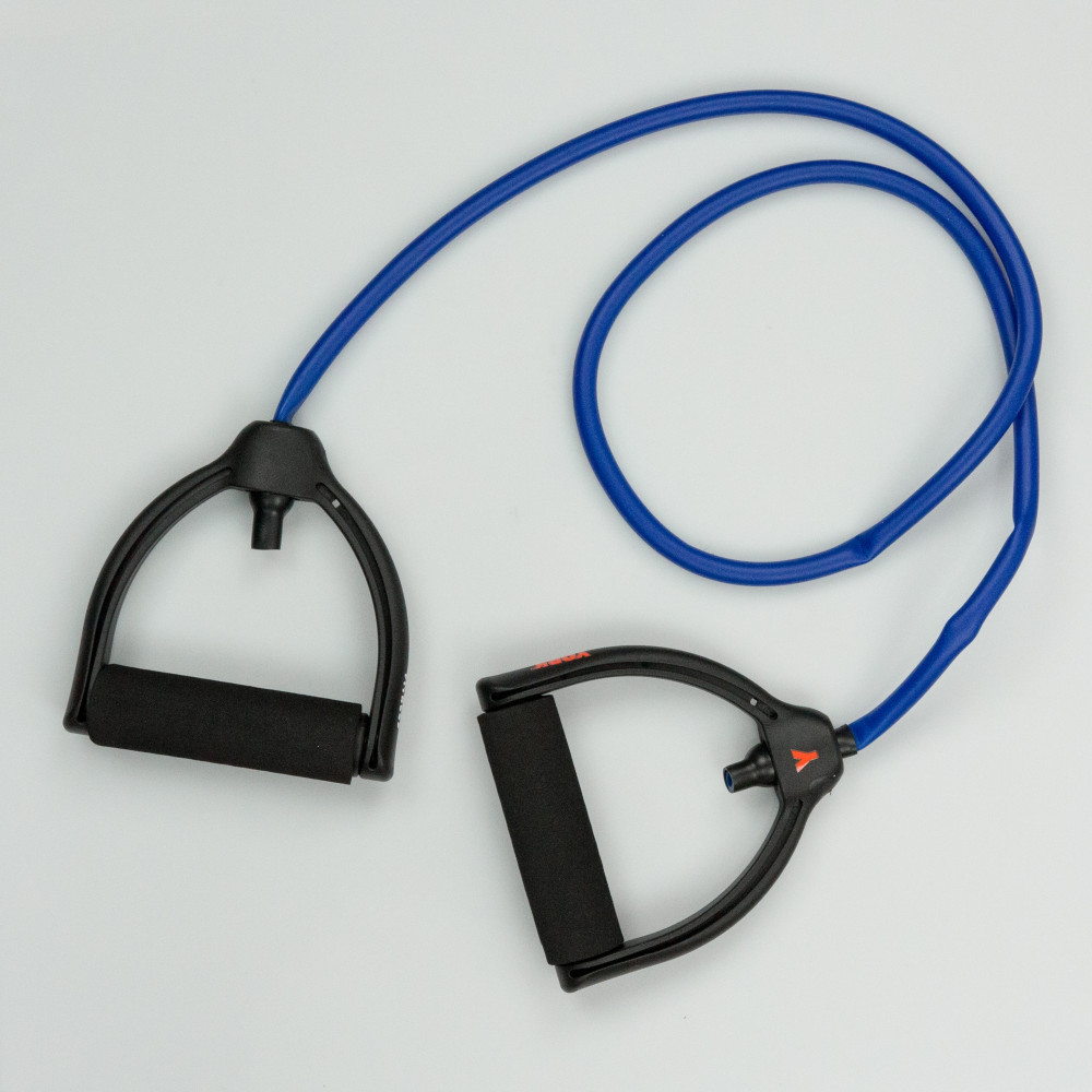 Guma w kolorze niebieskim z czarnymi uchwytami. Uchwyt z miękkim, piankowym wykończeniem. Przeznaczona do ćwiczeń pilates, treningu fitness oraz ćwiczeń rehabilitacyjnych